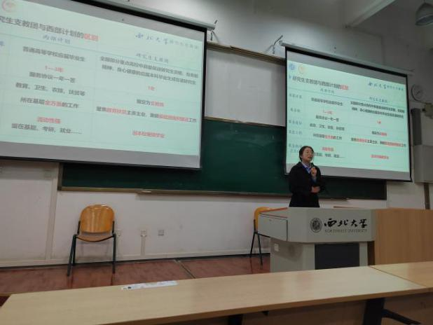 On March 18, the Youth Development Service Center of the School of Foreign Languages invited Yang Jingjing, a member of the 23rd Graduate Volunteer Teaching Corps of Northwest University and a 2022 graduate student in Foreign Language and Literature, to share her volunteer teaching experiences with the 2022 undergraduate cohort. She introduced the history of the Chinese Youth Volunteer Poverty Alleviation Relay Plan, the Graduate Volunteer Teaching Program at Northwest University, its recruitment process, and her personal teaching experiences. Her sharing inspired the students to appreciate the real significance of education and the profound meaning of “spending a short year doing something unforgettable for a lifetime”.
