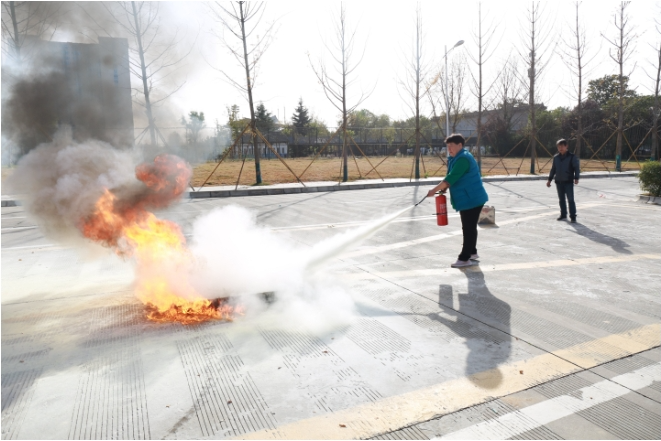 Subsequently, the head of fire safety training guided representatives of teachers and students in rehearsing firefighting by using asbestos blankets for "smothering method", carbon dioxide fire extinguishers for gas fire, and dry powder fire extinguishers for liquid fire. Through hands-on exercises, participants learned how to correctly use fire-fighting equipment, handle emergency situations, and extinguish fires.