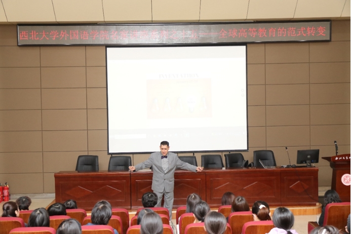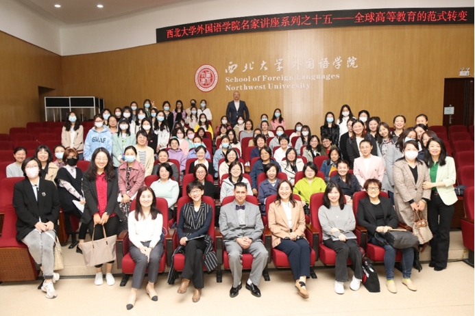 At 4:30 PM,April 26, 2023,  Professor Ray Taheri from the University of British Columbia in Canada was invited to give the 15th lecture in the “Distinguished Lecture Series” at the School of Foreign Languages, Northwest University. The lecture, titled “Global Paradigm Shift in Higher Education”, was held in the Lecture Hall of the Second Classroom of our school and was attended by around a hundred faculty and students.