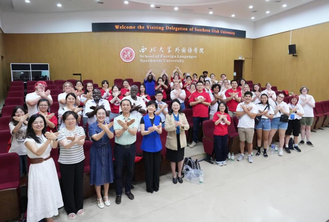 On the afternoon of May 20, 2025, the School of Foreign Languages at Northwest University welcomed a study tour group from Southern Utah University at the Chang’an campus. The event, themed “Dialogues Across the Pacific,” successfully facilitated cultural exchange between China and the United States. With the coordination of the School of International Education at Northwest University, the 17 students and 3 faculty members from Southern Utah University engaged in close interactions with the graduate student volunteers from our school. The event was attended by Zhao Zhihao, the Party Secretary of our school, Cao Ruonan, the Dean, and other relevant faculty representatives.