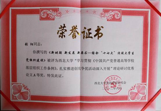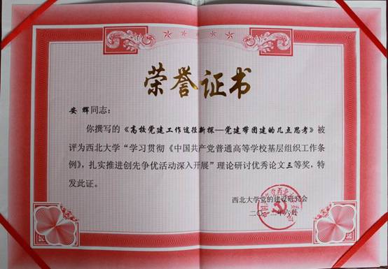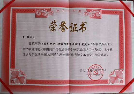6月26日下午,校党委在太白校区大礼堂隆重召开“学习贯彻《中国共产党普通高等学校基层组织工作条例》,扎实推进创先争优活动深入开展”征文活动表彰大会。王强书记撰写的《创新争优 积极推进高校院系党建工作》被评为优秀论文二等奖,安辉老师撰写的《高校党建工作途径新探——党建带团建的几点思考》和2009级本科生张阳撰写的《新时期 新发展 新要求——结合“十七大”浅谈大学生党组织建设》均荣获三等奖;我院党委荣获优秀组织奖。