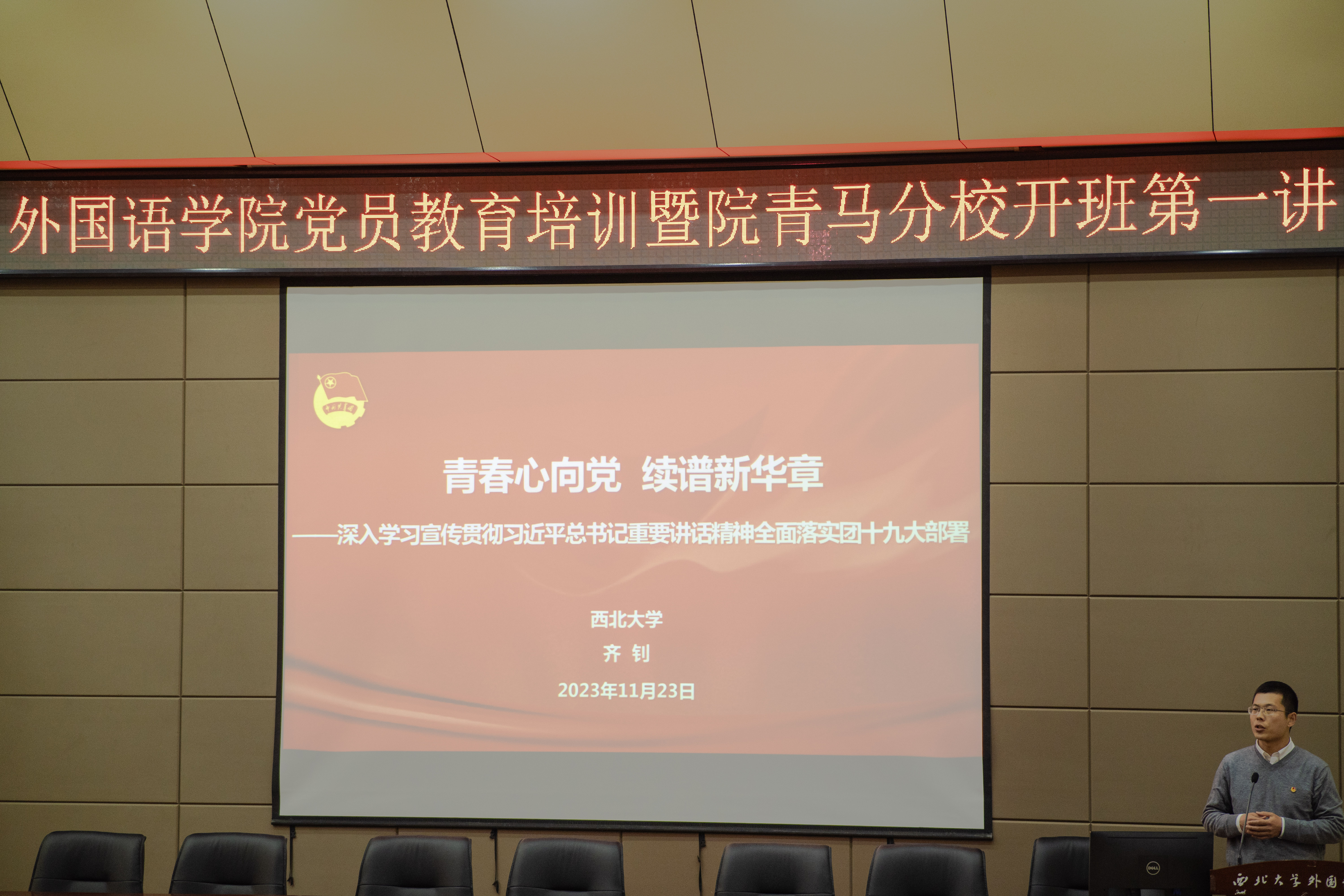 2023年11月23日下午,外国语学院青马分校第四期大学生骨干培训班开班第一讲在第二课堂报告厅举行。活动邀请到校团委副书记、马克思主义学院副教授齐钊老师作题为《青春心向党 续谱新华章——深入学习宣传贯彻习近平总书记重要讲话精神全面落实团十九大部署》的主题讲座,本期培训全体学员参与学习。