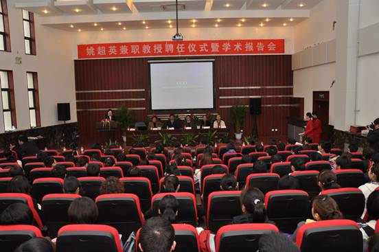 聘任仪式后,姚超英副秘书长用流利的英语为外国语学院师生作了主题为“商务礼仪”的学术报告。