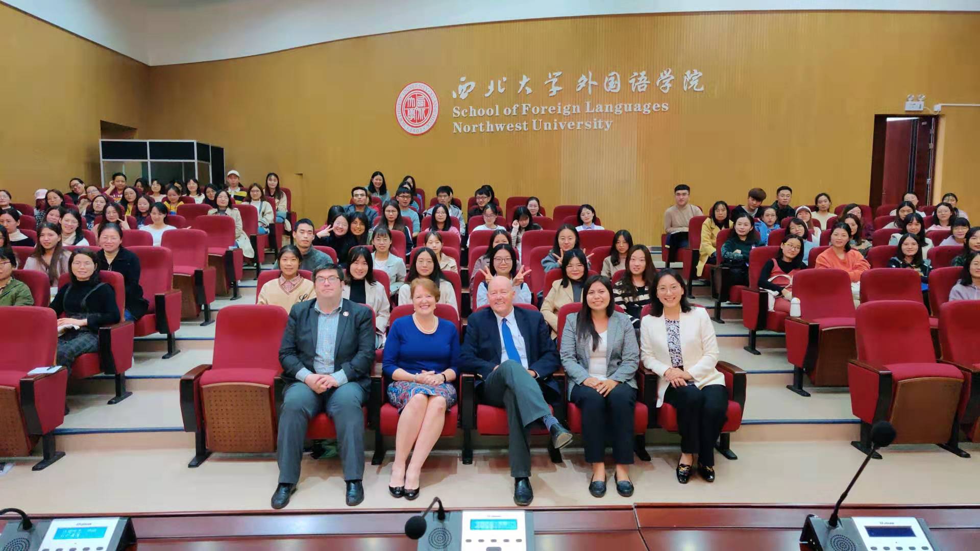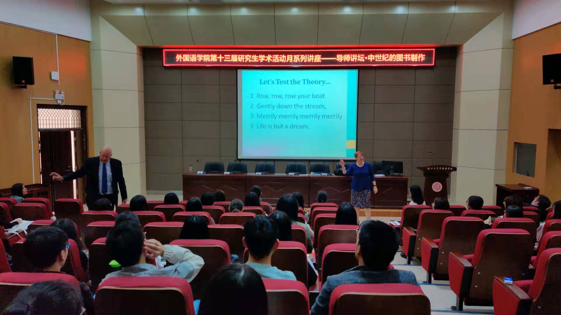 2019年10月23日下午,我院三位外籍英语教学专家娜塔莉·雷耶斯(Natalie Reyes)、肯尼思·亨特(Kenneth Hunt)及辛西娅·亨特(Synthia Hunt) 走进第二课堂为百余师生带来三场主题特色鲜明的讲座。娜塔莉结合自身故事分享了她在平利县中学的支教经历和收获;肯尼思以别开生面的形式与大家一起讨论了治污及减排相关内容;辛西娅生动地介绍了美国各个阶段的音乐教育情况。我院2018级、2019级研究生听取了报告。