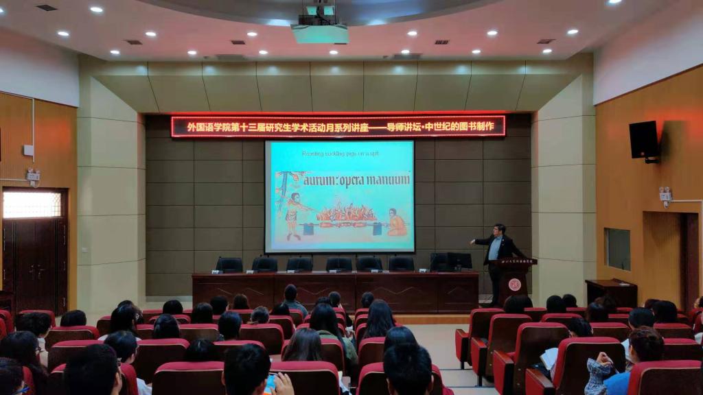 1023日下午,由研究生院、研究生工作部主办,外国语学院承办的“导师讲坛”第一百三十二讲在长安校区外国语学院第二课堂举行。外国语学院外籍专家罗宾·吉尔班克副教授应邀作了题为“中世纪的图书制作”的专题学术报告。该报告由外国语学院研究生秘书周丹主持,全院百名师生参会。