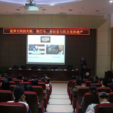4月24日,美国富布莱特杰出教授、丹麦哥本哈根大学资深教授罗素·邓肯做客我院。在外国语学院第二课堂活动中心做了题为“世界大同的失败:奥巴马、希拉里和民治党的遗产”的报告。此次报告由外国语学院副院长任海棠教授主持,外国语学院师生参与了本次活动。