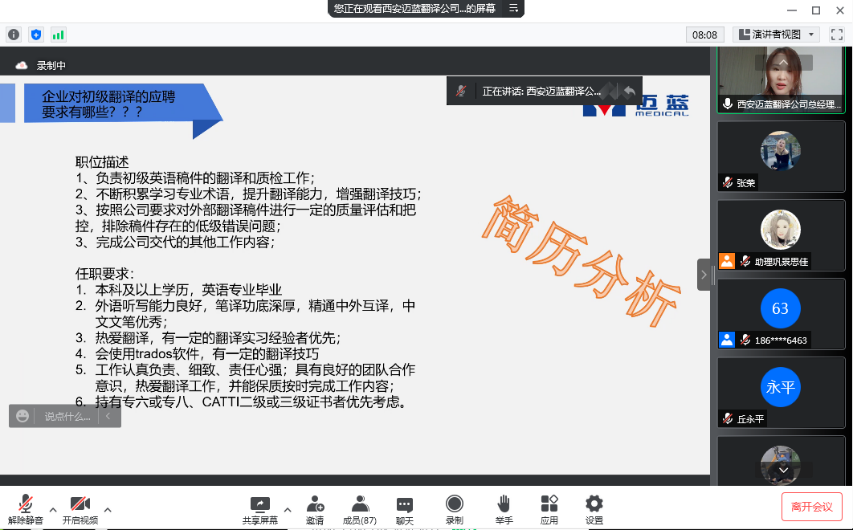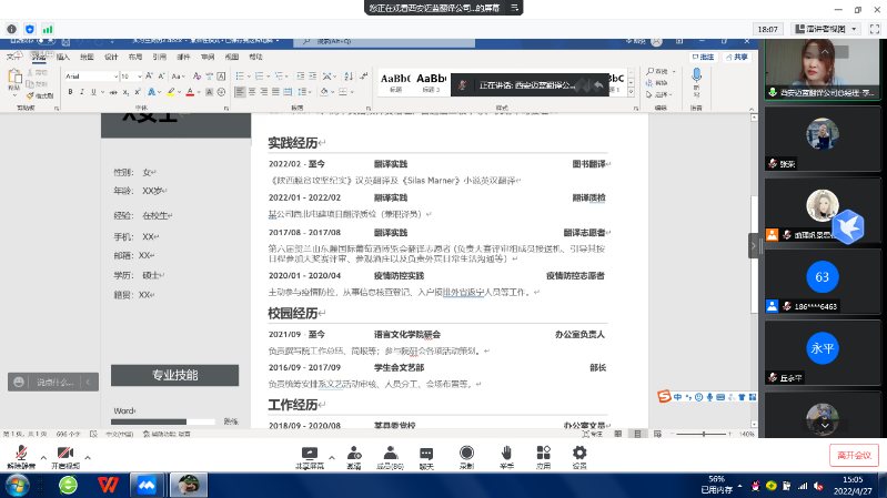 4月27日下午,应我院MTI中心邀请,迈蓝翻译公司总经理李凯悦为我院师生进行线上宣讲。我院2021级全体专业硕士参会,会议由学院MTI中心主任季建芬教授主持。