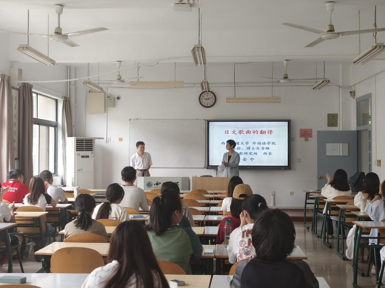 金中教授从中日诗歌在韵律方面均以音数律为基础、各音节等时这一核心原理出发,深入浅出地介绍了其独创的日文歌曲译配方法——“分割对应法”。金教授指出,该方法能有效保证译文语音结构与音乐旋律的对应关系,最大程度地贴近日语原文,从而在歌唱中精准还原原曲的韵味与风貌。他强调,日文歌曲译配不仅是一项能极大激发学生学习兴趣的活动,更是一种极具挑战性的高难度综合训练,对于提升学生的日汉翻译能力具有显著效果。金教授以其深厚的学养和生动的讲解,带领同学们领略了中日语言转换的艺术魅力,为同学们的翻译学习与实践打开了新思路。