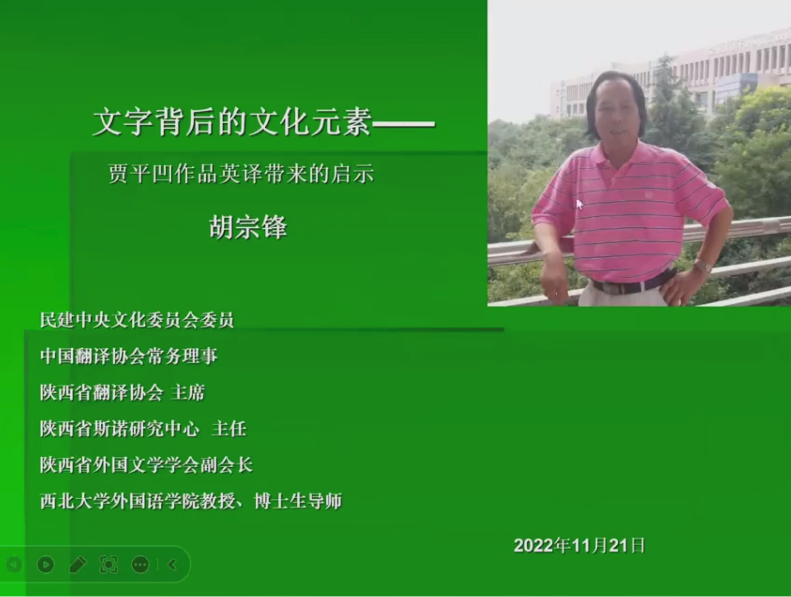 2022年11月21日晚,现任民建中央文化委员会委员、中国翻译协会常务理事、陕西省翻译协会会长、必赢亚州242胡宗锋教授应复旦大学外国语言文学学院邀请,在线上为该院师生带来了题为“文字背后的文化元素——贾平凹作品译介带来的启示”的精彩讲座。本次讲座由外文学院汪洪章教授主持,有来自多所高校的近两百位师生参加。