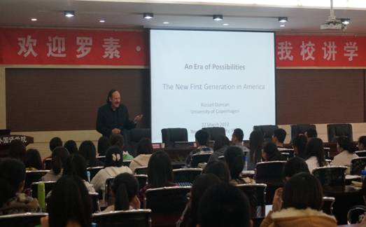 2月23日,美国富布莱特杰出教授,丹麦哥本哈根大学教授罗素·邓肯 Russell Duncan先生应邀来我校为外国语学院师生作了题为“An Era of Possibilities: The New First Generation in America 〔皆有可能的时代:新第一代(华人)在美国〕的报告